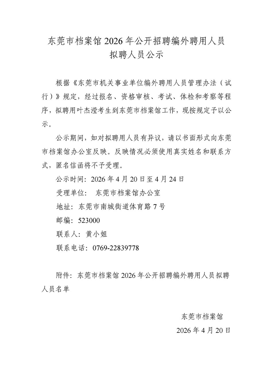 东莞市档案馆2026年公开招聘编外聘用人员拟聘人员公示